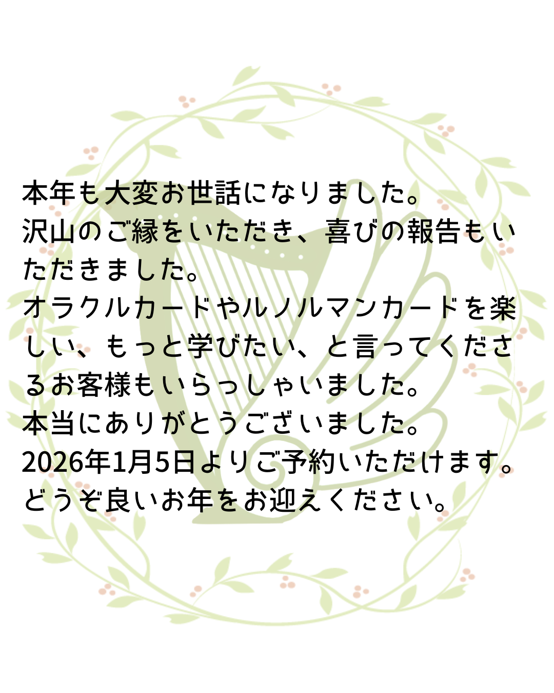 今年も大変お世話になりました 2025.12.31 この記事は約1分で読めます。 みなさまこんにちは(^^)音と神託の紡ぎ手さゆらです。 本年も大変お世話になりました。沢山のご縁をいただき、喜びの報告もいただきました。オラクルカードやルノルマンカードを楽しい、もっと学びたい、と言ってくださるお客様もいらっしゃいました。本当にありがとうございました。2026年1月5日よりご予約いただけます。どうぞ良いお年をお迎えください。 Tweet